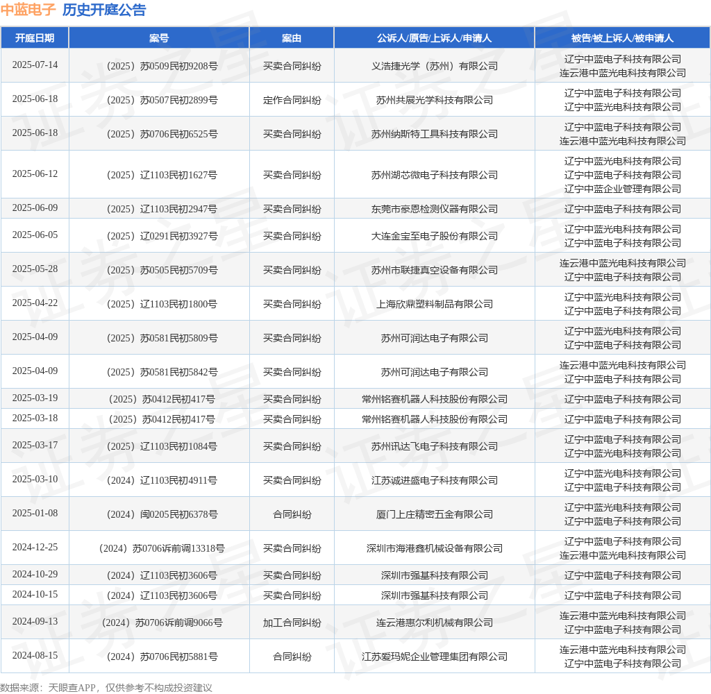 案号:(2025)苏0706民初6525号审理法院:连云港市海州区人民法院案由:买卖合同纠纷当事人信息: 原告/上诉人:苏州纳斯特工具科技有限公司 被告/被上诉人:辽宁中蓝电子科技有限公司、连云港中蓝光电科技有限公司开庭日期:2025年6月18日根据统计,近一年内以辽宁中蓝电子科技有限公司为当事人的历史开庭公告有20则,其中案由为“买卖合同纠纷”的公告以16则居首,其次为“合同纠纷”有2则,“加工合同纠纷”有1则。历史开庭公告如下: